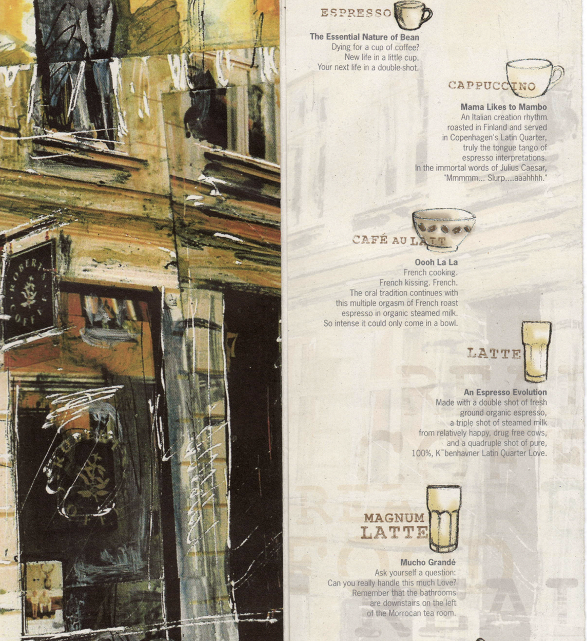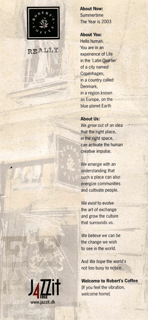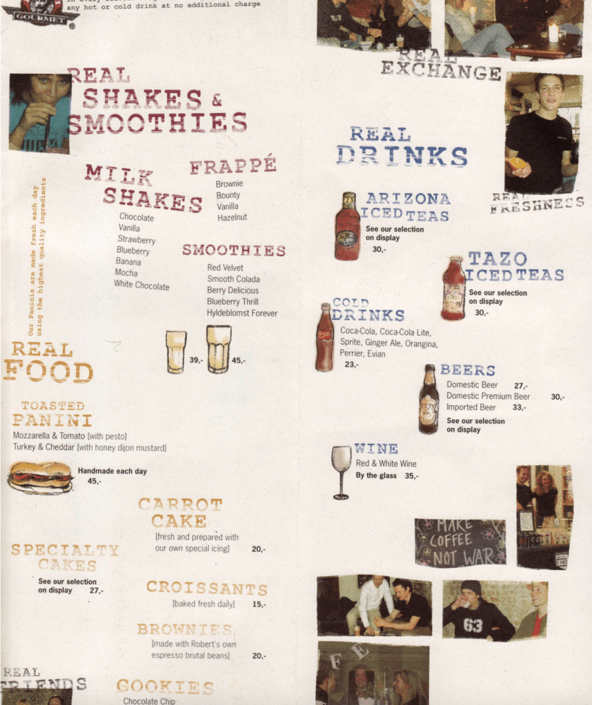 We launched Robert’s Coffee in Copenhagen, building out their brand and identity, hosting co-branded music and art events through their first summer in existence. In a city of 3000 cafés, Robert’s became a top ten coffee shop and lounge destination.The printed menu, shown below, had its visuals and specials updated weekly, was made to be taken home as a souvenir, and featured real customers and staff. ( The tagline was Really.)