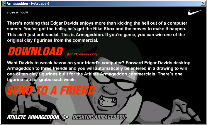 Working alongside Wieden + Kennedy in London and Amsterdam, I helped create the digital launch for Nike Shox in Europe that leveraged a stop-motion concept based on the English TV program, Spitting Image. The writing riffs on the general tone of the show.