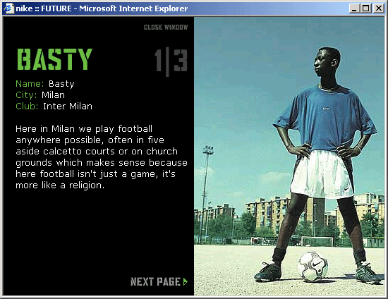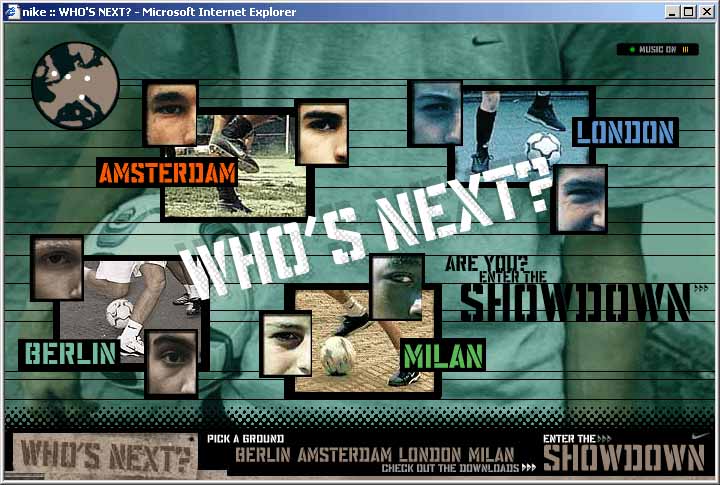 I served as a senior creative on the ‘Who’s Next’ campaign for Nike Football, a search for Europe’s next soccer superstar set in the storied squares of Paris, London, Amsterdam and Milan. We found the most compelling young street footballers, shot and shared videos of their best moves, and invited users to upload their own videos to the site. (Pretty radical for 2001.) The campaign served to set the foundation for Nike’s position in world football today.
